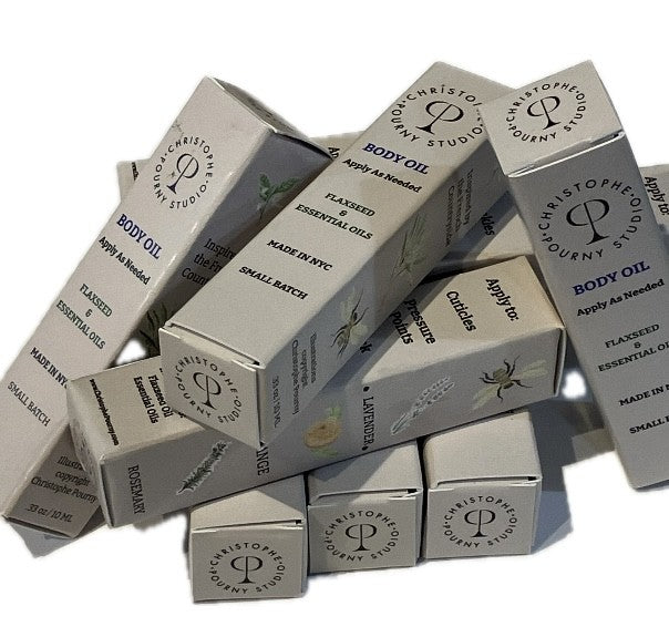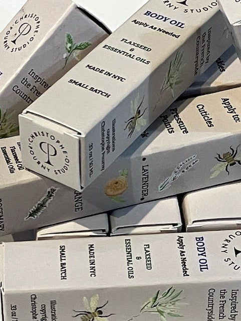 All natural formula of flax seed and essential oils. Apply to cuticles, pressure points, elbows, or wherever needed. Provides aromatherapy benefits. Mixed in small batches in NYC. Choose Lavender, Rosemary, or Sweet Orange scent. 10 Ml glass vial with stainless steel roller-ball is convenient to slip in pockets or bags. Not intended for consumption. Each Body Oil is boxed individually. Watercolor illustrations by Christophe Pourny.